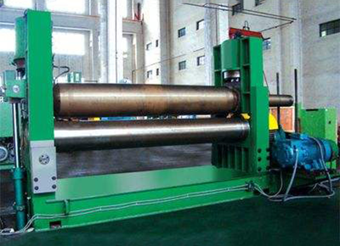 本機結構型式為三輥對稱式,上輥在兩下輥中央對稱位置作垂直升降運動,通過絲桿絲母蝸桿傳動而獲得,兩下輥作旋轉運動,通過減速機的輸出齒輪與下輥齒嚙合,為卷制板材提供扭矩。